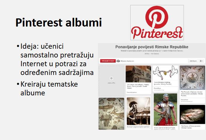 Učenici 1.a razreda (smjer opće gimnazije) su u sklopu nastavne cjeline „Povijest Rimske republike“ aktivno koristili Pinterest. [4] Ciljevi zadatka su bili samostalno pretraživanje slikovnih povijesnih izvora, vrednovanje istih, te učenička suradnja u oblikovanju mape sadržaja vezanih uz nastavnu cjelinu. Većina učenika je probrane linkove dijelila putem zatvorene razredne Facebook grupe. Manji dio ih se registrirao na Pinterest i dijelio materijale u zajedničkoj mapi. Zadatak je trajao tjedan dana, a nastavnik je tijekom izvršavanja zadatka komentirao i davao povratne informacije. Najbolji primjeri po izboru nastavnika i najzanimljiviji po izboru učenika su dodatno prezentirani na satu ponavljanja.