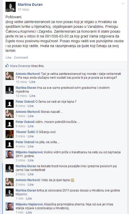 Mala zanimljivost s jedne lokalne Fejs grupe – kopiram: “Martina je obrisala svoj oglas o poslu nakon samo 15 minuta. Baš kad sam htio objaviti ovaj komentar (podaci prema njihovom financijskom izvjestaju): “The total commissions paid out by Karatbars in 2013. It was $4,821,416. Euros or $7,405,926. Canadian Dollars . If you divide this amount among all 110,000 Karatbars affiliates worldwide you get an average of $67.32 Canadian Dollars average annual income by each affiliate.”