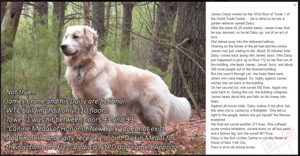 Sljedeći je primjer potpunog izmišljanja priče. Radi se o temi terorističkog napada na World Trade Center 2001. godine. Priča se o kuji Daisy koja je navodno spasila stotine ljudi iz Tornja 1. Obzirom da je priča vrlo zanimljiva krenuo sam istraživati samo sa 3 ključne riječi dog+daisy+wtc. Rezultat je nažalost poražavajući za sve ljubitelje herojskih pasa.