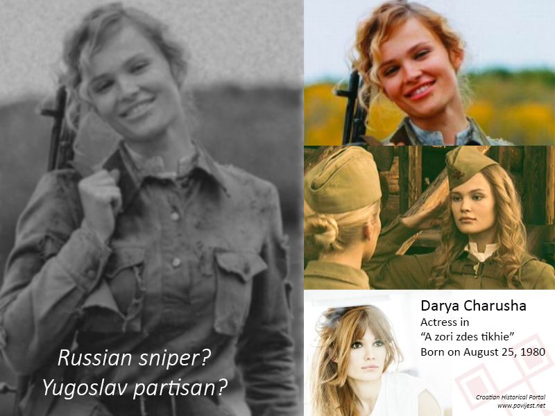 Ova se fotografija često pojavljuje uz ključne riječi poput sovjetska snajperistica, snajperistica iz Drugog svjetskog rata, sovjetska partizanka ili jugoslavenska partizanka. Pretraživanjem takvih ključnih riječi uz dodatak “movie” došao sam do izvornih snimki i podataka o čemu se zapravo radi. Radi se zapravo o sceni iz TV serije, a “snajperistica” je zapravo glumica Darya Charusha.