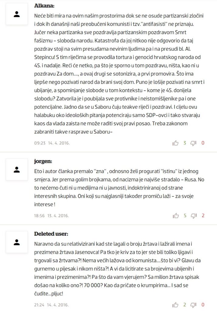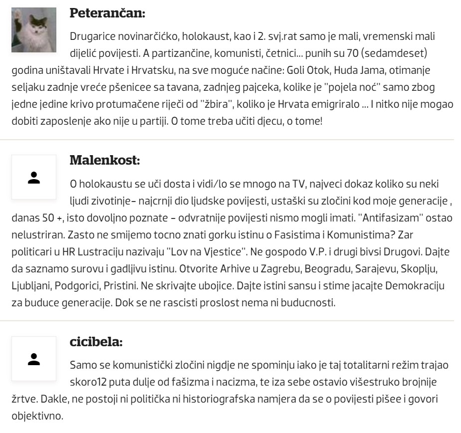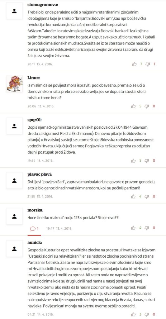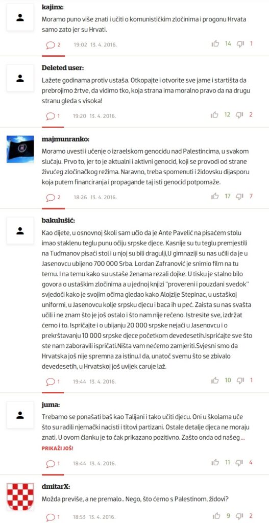Izvor: Kustura, I., O holokaustu se uči premalo, ustaški zločini su relativizirani, Večernji list, br. 18758, 13.4.2016. URL: https://www.vecernji.hr/vijesti/o-holokaustu-se-uci-premalo-ustaski-su-zlocini-relativizirani-1075826