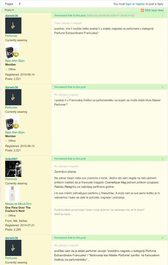 Što je Frangrantica kojom se pohvalio? Prema opisu na web stranici Fragrantica je online enciklopedija, društvena mreža o parfemima i mjesto za ocjenjivanje parfema. Pozivaju sve parfumere da im se jave sa svojim parfemima. Parfemi T. Vrbanca su ušli među 53166 parfema koliko ih je trenutno indeksirano na toj stranici. Čestitam! Dodatno zgodno iznenađenje sam doživio klikom na hrvatsku verziju Fragrantice. Otvara se stranica punmiris.com, a to je upravo onaj gore spomenuti forum na kojem je bilo postavljeno pitanje o nagradi Perfume Extraordinaire.
