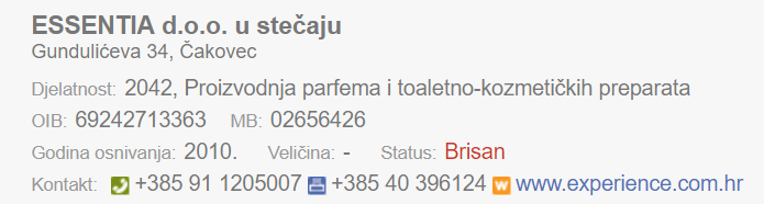 Nažalost, premda su prema njihovim riječima bili jedini proizvođač čistih parfema u Europi, Essentia je završila u stečaju. Čak im je i web sajt hackiran.