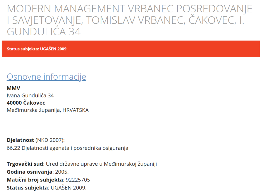 Radi li se o istom Tomislavu Vrbancu ili je slučajno da ih je više koristilo istu poslovnu adresu? Google nema baš informacija o “Modern Management Vrbanec” osim neke rasprave o navodnoj prijevari na ovom linku.