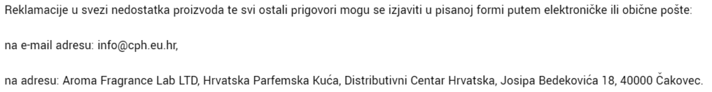 Pregledao sam još jednom cijelu web stranicu Hrvatske parfemske kuće i nisam našao konkretnu informaciju o proizvodnji, zaposlenicima i sl. Osim veleprodaje i maloprodaje u robnoj kući Međimurka, navedena je adresa u Bedekovićevoj ulici u Čakovcu i adresa londonske tvrtke. Uz to online trgovina u kojoj piše “Molimo da plaćanje izvršiš direktno na naš žiro račun. Kao poziv na broj upiši svoj broj narudžbe. Narudžba će biti poslana kada uplata bude vidljiva na našem računu.” ne radi! Moram poslati reklamaciju na njihovu adresu.