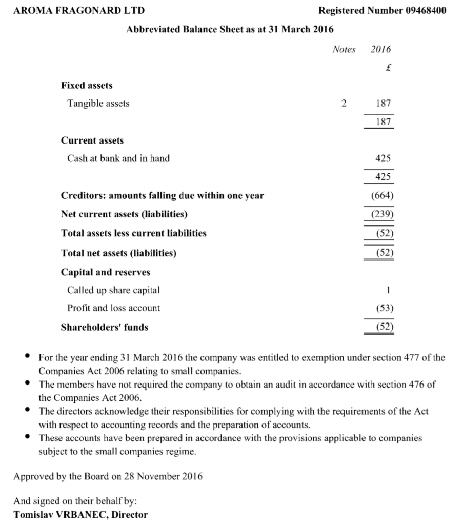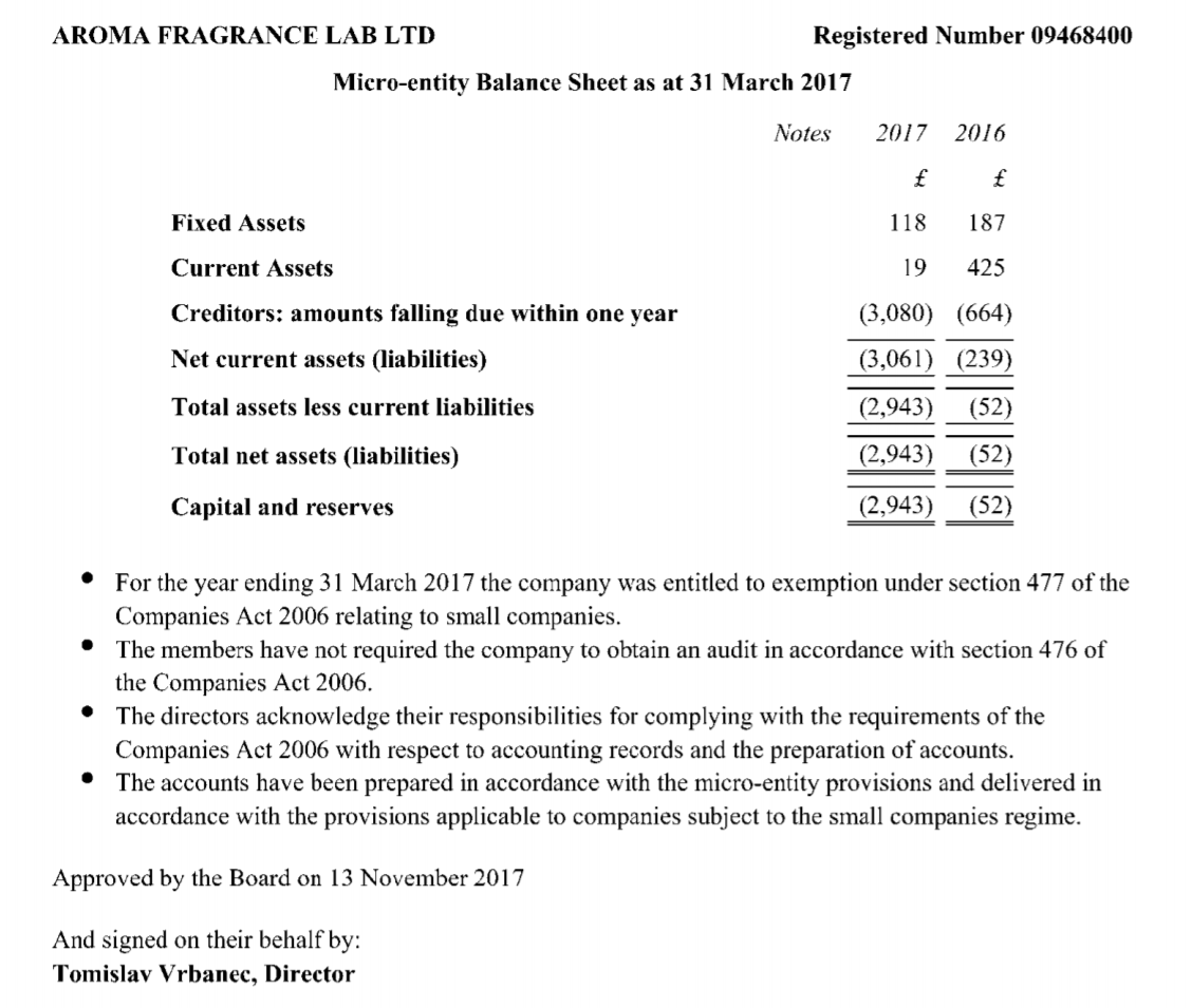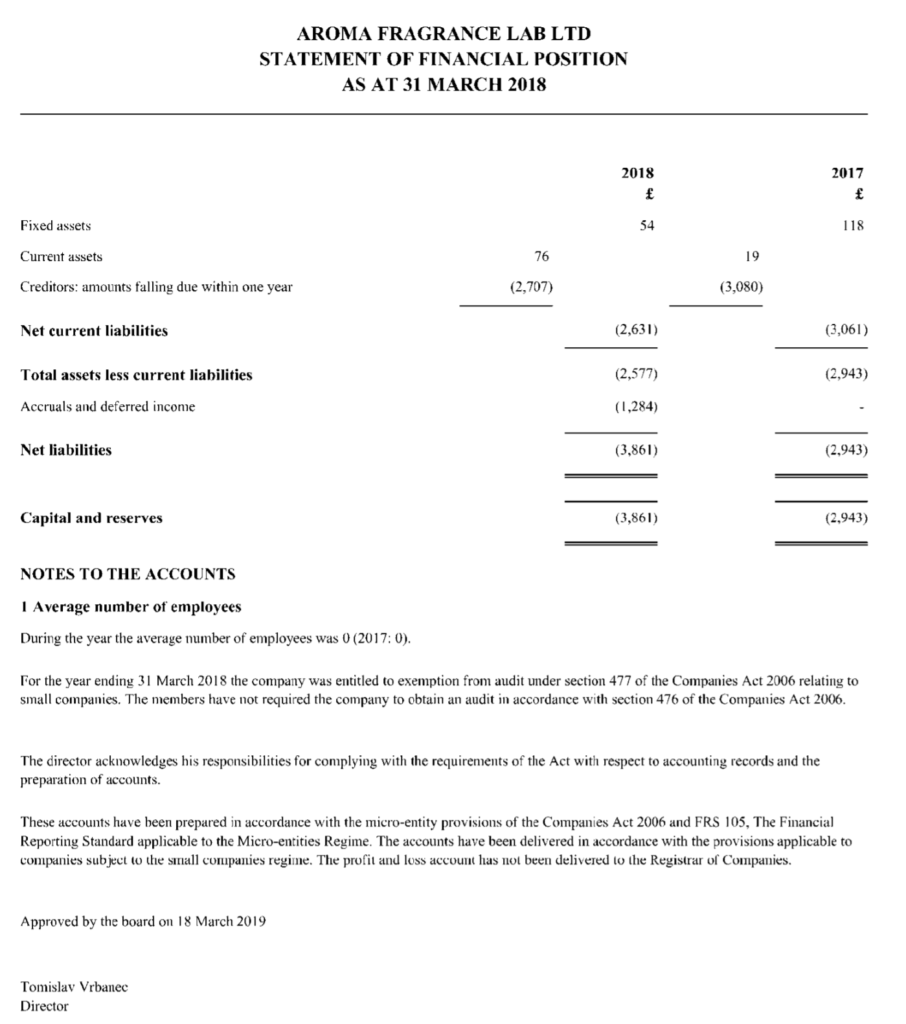 Dakle, ako dobro shvaćam, Aroma Fragrance Lab ima jednog zaposlenog koji je ujedno i direktor, a prošle su godine na računu imali 76 funti (oko 650 kuna po današnjem tečaju)? Što li će im se tek dogoditi nakon Brexita?!?