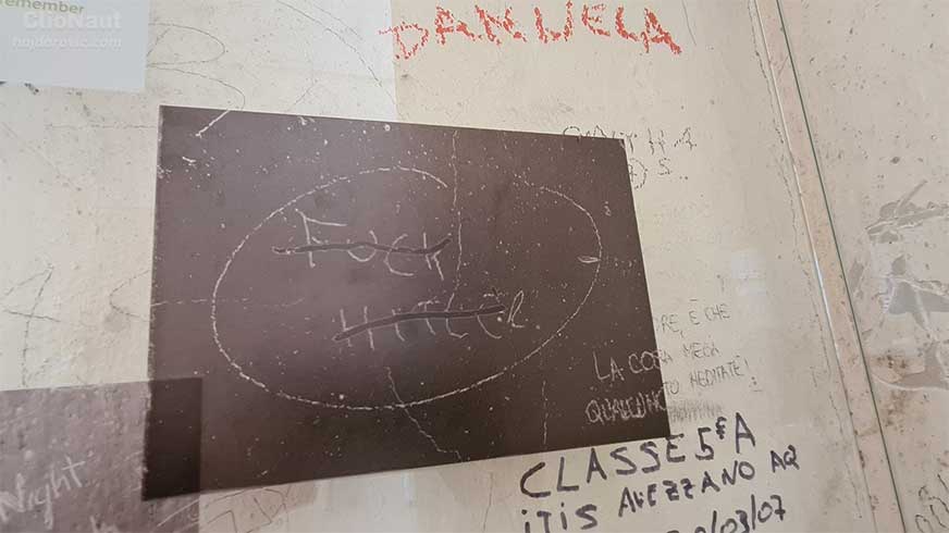 Da se vratimo na početnu ilustraciju. Premda su vjerojatno žrtve u agoniji tijekom trovanja Zyklonom B vjerojatno i izgreble zidove plinske komore ta ilustracija to ne pokazuje. Podsjećam da su 4 komore uništene, a peta je renovirana u ratu i nakon njega kada je pretvorena u muzejski objekt. Nažalost i mjesta poput bivših logora smrti su objekti vandaliziranja, pa često na skrivenim mjestima možemo pronaći svakakve poruke. Izmišljanje ili namještanje priče možda može prouzročiti neku emocionalnu reakciju no može li zapravo doprinijeti osvješćivanju?