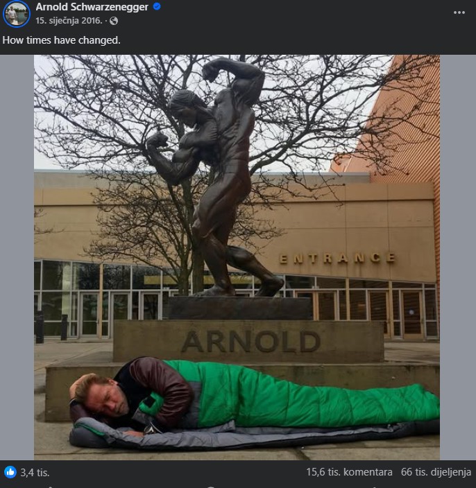 Jutrošnje listanje društvenih mreža izbacilo je jednu zanimljivu objavu koja je u meni odmah probudila crv sumnje da možda nije istinita. Radi se u objavi u kojoj se na fotografiji vidi Arnold Schwarzenegger kako navodno spava u vreći ispred hotela koji mu je obećao da će kod njih uvijek imati sobu za njega. Uz to slijedi i kraći tekst o materijalizmu i vrijednostima.