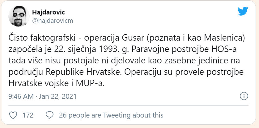 Na logički i kronološki propust u argumentima ljutitih HOS-ovaca uskoro je ukazao povjesničar Miljenko Hajdarović. “Čisto faktografski – operacija Gusar (poznata i kao Maslenica) započela je 22. siječnja 1993. g. Paravojne postrojbe HOS-a tada više nisu postojale ni djelovale kao zasebne jedinice na području Republike Hrvatske. Operaciju su provele postrojbe Hrvatske vojske i MUP-a”, napisao je Hajdarović na Twitteru.