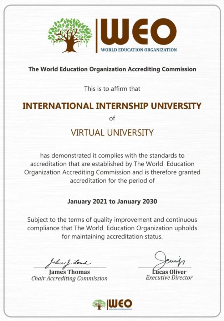 Treći certifikat nazvali su Certificate of Accreditation. Prema njemu World Education Organization potvrđuje akreditaciju IIU za Virtualni Univerzitet od 2021. do 2030. g. World Education Organization ne postoji. Prvi sljedeći spomen te organizacije je izgleda još jedan scam projekt Remarkable Education čiju vrijednost (u podnožju) garantiraju IIU i WEO.