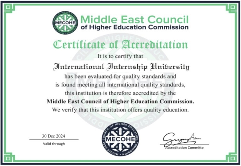 Sljedeći certifikat nazvali su International Accreditation, a dodijelio ga je Middle East Council of Higher Education Commission. Organizacija pod tim imenom je postojala u devedesetim godinama prošlog stoljeća i navodno je djelovala na prostoru Arapskog poluotoka. Jedino mjesto gdje se danas spominje je IIU stranica certifikata. Smatram da je certifikat izmišljen.