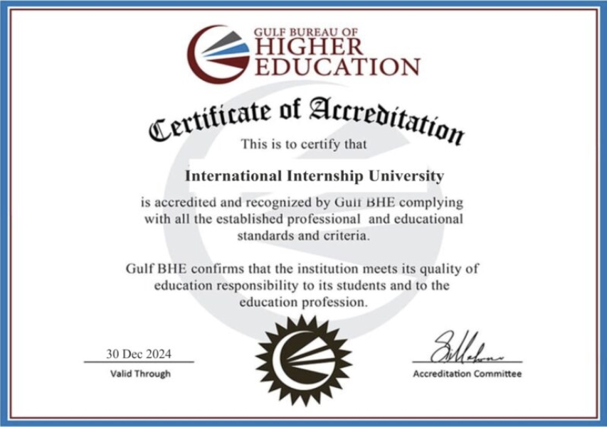 Slijedi još jedan International Accreditation certifikat koji vizualno potpuno isto slijedi dizajn prethodnog. Ovaj certifikat navodno dodjeljuje Gulf Bureau of Higher Education. Na internetu postoji nešto pod tim imenom, ali koristi drugi logotip. Premda piše respected and reputable independent regulating organization for higher education in the Middle East to meni izgleda kao još jedan fake.