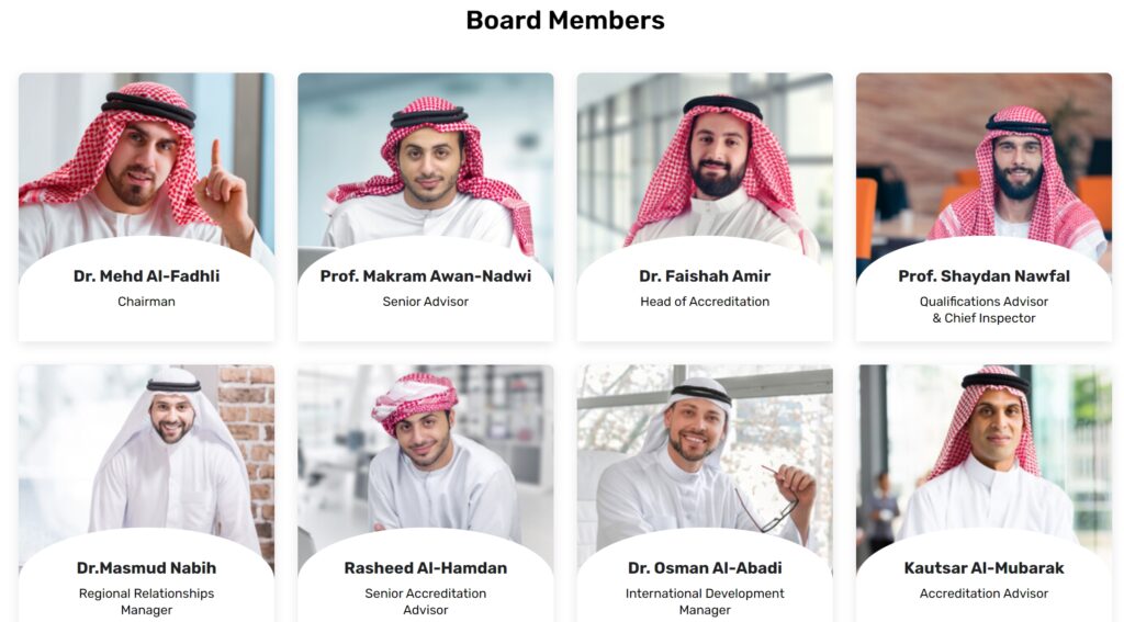 Pogledajmo samo upravni odbor. U prvome redu treći je navodno šef za akreditiranje. Navodni Dr. Faishah Amir se pojavljuje i na drugim web stranicama uz druga imena (Yousef, Arslan) i poslove (npr. model za aparatić za uređenje brade). Kautsar Al-Mubarak se na stranici iStockPhoto opisuje kao portrait of muslim businessman with arms crossed. Sve redom tipične stock fotografije.