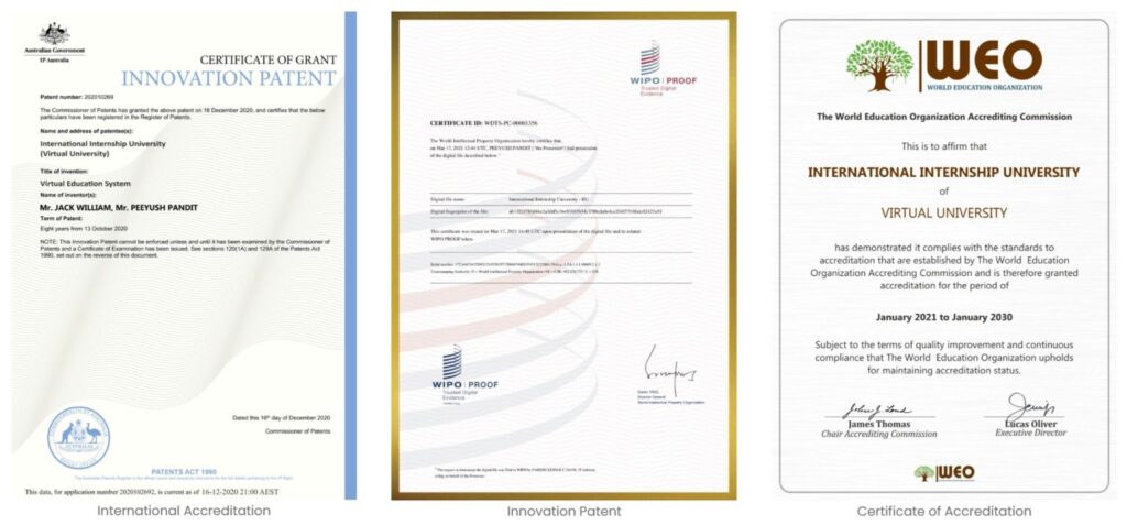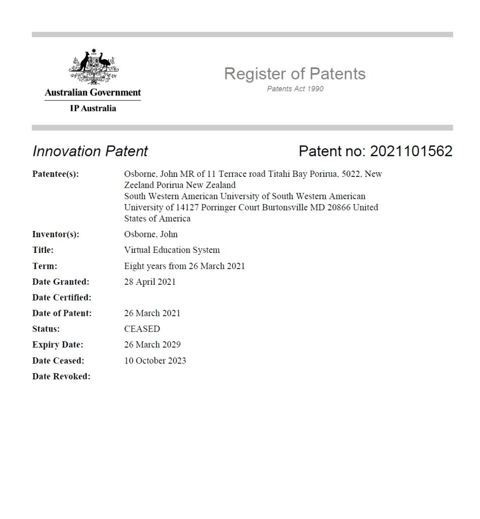 Prvo sam tražio po broju patenta. NEMA. Tražio sam patent dodijeljen International Internship University. NEMA. Tražio sam Virtual University. NEMA. Tražio sam imena Jack W. i Peeyush P. NEMA. Tražio sam po nazivu inovacije Virtual Education System. NAĐENO ali podnositelj je John Osbore s Novoga Zelanda 2021. g.