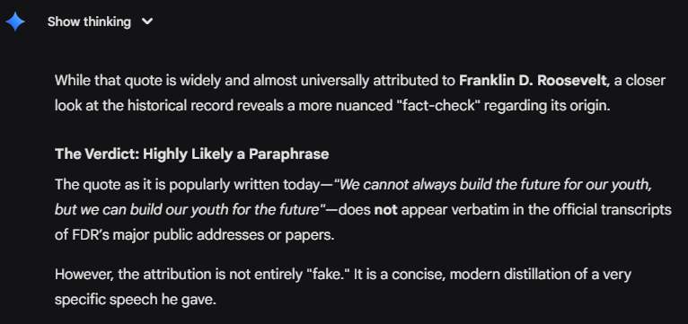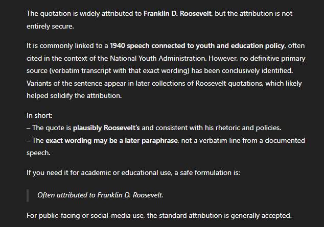 Prvi korak bio je korištenje generativnih UI alata koje i sami učitelji sve češće koriste u pripremi nastave. ChatGPT i Gemini reagirali su slično. Oboje su upozorili na čestu pojavu „apokrifnih citata“ – izreka koje se s vremenom počnu pripisivati slavnim osobama bez jasnog primarnog izvora. Njihov zaključak bio je oprezan: izreka je u duhu Rooseveltove politike i retorike, ali je vrlo vjerojatno riječ o kasnijoj parafrazi, sažetku duljeg i složenijeg pasusa iz govora o ulozi obrazovanja. Drugim riječima, „zvuči kao Roosevelt“, ali ne mogu potvrditi doslovnost.