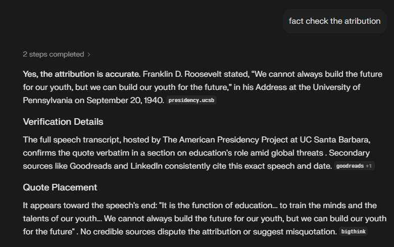 Treći alat, Perplexity, dao je drukčiji odgovor. Umjesto oslanjanja prvenstveno na sekundarne interpretacije, usmjerio se na provjerljive izvore. Rezultat je bio jasan: izreka se doista nalazi u govoru Franklina D. Roosevelta održanom 20. rujna 1940. godine na Sveučilištu u Pennsylvaniji, u sklopu obilježavanja 200. obljetnice sveučilišta. Transkript govora, dostupan u okviru American Presidency Projecta Sveučilišta u Kaliforniji (Santa Barbara), sadrži upravo tu rečenicu, i to doslovno, pri kraju govora, u kontekstu rasprave o ulozi obrazovanja u vremenu globalnih prijetnji.