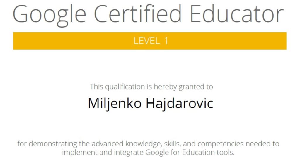 Sa zadovoljstvom mogu objaviti da sam danas uspješno položio ispit i stekao certifikat “Google Certified Educator Level 1”. Više o