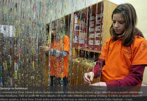 In the summer of 2008 MacIntyre presented his idea in Jerusalem during an International Conference on the Holocaust and Education. One of the listeners was a young history teacher from Croatia. Miljenko Hajdarovic, a teacher at Senkovec Primary School, who started a similar project called “Classroom Holocaust Museum”. With a group of 25 pupils he collected 153.000 paper clips as a main exhibit in their small museum. The museum was opened on 27th of January 2009. The museum contained paper clip chains, photos, different objects connected with the subject (an old camera, a phone, broken glass as a symbol of Kristallnacht, a travel bag, bunch of shoes, a rice bowl as a symbol of the daily allowable amount of food…). On the day of the opening the students hosted Oto Konstein, a survivor of Auschwitz and Bergen-Belsen. His testimony was recorded and was distributed on DVD to 30 schools in Medjimurje County.