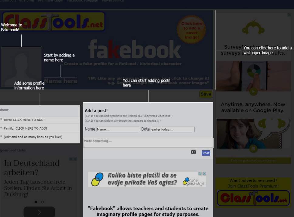 And what is Fakebook? Fakebook is a online tool that helps you produce Facebook like profiles without the Facebook account. You can find it here: http://www.classtools.net/FB/home-page. There is a simple online tutorial to help you. You simply add information or multimedia and students could do the project outlined above on Fakebook instead of Facebook. So, the final result can be something like a page about a historical person or event in just the same way. This is therefore a useful alternative tool for people working in schools where there are strict policies about access to Facebook