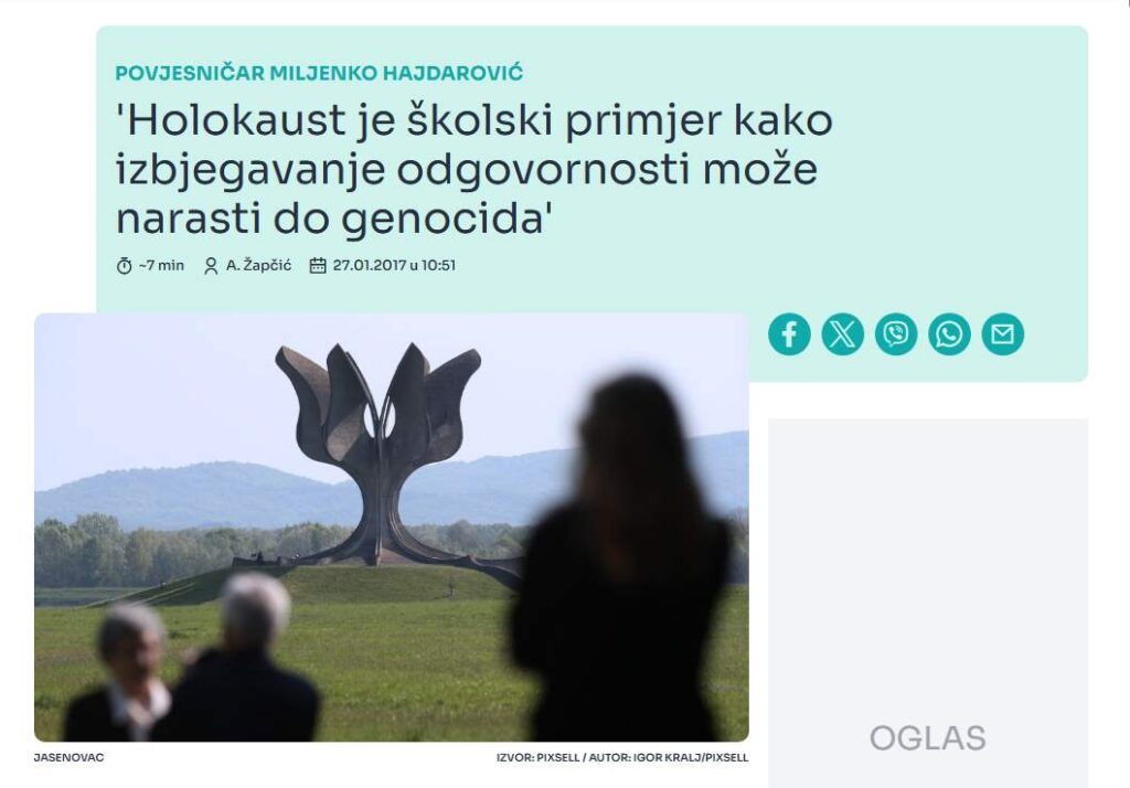 Prilikom prisjećanja na žrtve holokausta 27. siječnja vrijedi se uvijek prisjetiti na činjenicu da je holokaust dio naše hrvatske prošlosti.