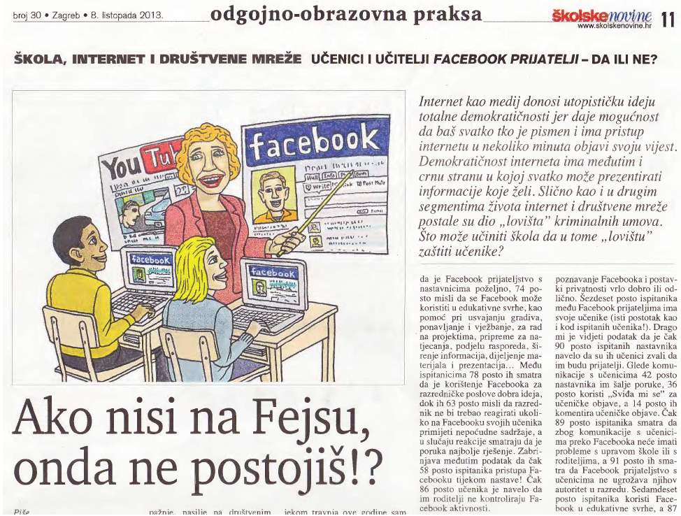 U 30. ovogodišnjem broju časopis Školske novine objavio je moj članak pod naslovom “Ako nisi na Fejsu, onda ne postojiš!?”.