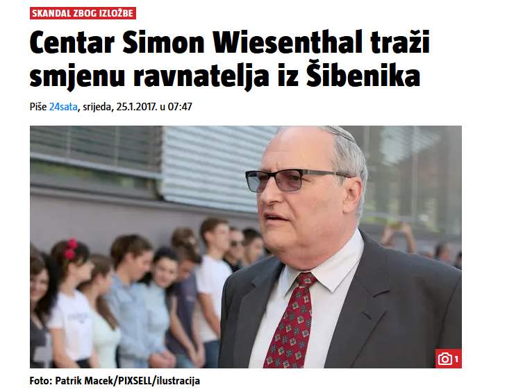 Centar Simon Wiesenthal uputio je prosvjedno pismo hrvatskom veleposlanstvu u Tel Avivu, zahtijevajući hitnu smjenu Josipa Belamarića, ravnatelja Tehničke škole u Šibeniku koji je zabranio izložiti