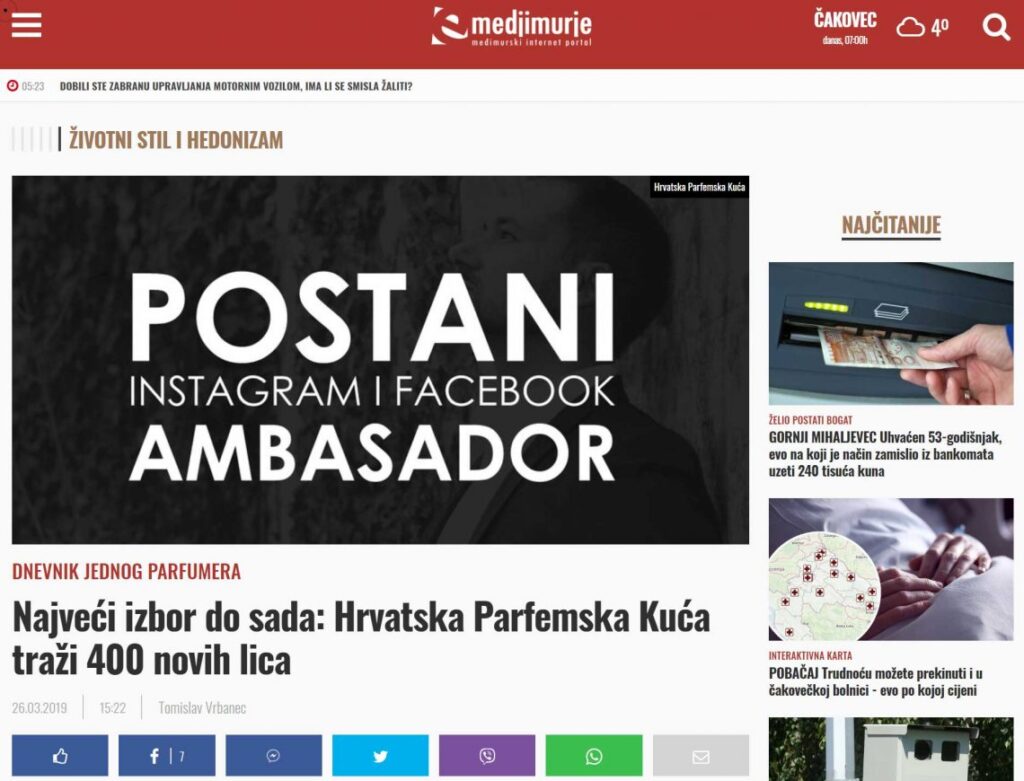 Lokalni internetski portal eMeđimurje jučer je objavio oglas vrlo zanimljiva naslova “Najveći izbor do sada: Hrvatska Parfemska Kuća traži 400
